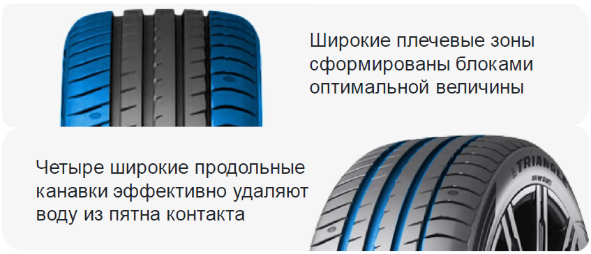 - Четыре широкие продольные канавки быстро отводят воду из пятна контакта. Это повышает устойчивость автомобиля на мокрой дороге и снижает риск потери сцепления.